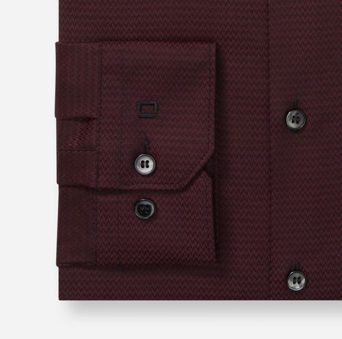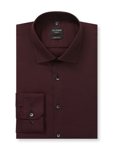 Körperbetonte Performance für den sportlich schlanken Mann. In stark taillierter Schnittführung und leicht elastischer Comfort-Stretch-Qualität, designt aus einem eleganten Gewebe mit dezentem Changé- und Webeffekt. Akzentuiert wird das OLYMP No. Six durch einen modischen New York Kent. Ein Business-Allrounder in noblem Bordeaux. Extra-langer Arm.