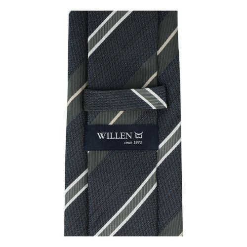 Die hochwertigen Willen Krawatten bestechen nicht nur durch ihr Design in Stoffen aus 100% Seide, sie werden in traditioneller Verarbeitung von Hand vollendet. Das Herzstück der Krawatte bildet die beidseitig aufgeraute Einlage, die sowohl in Gewicht, als auch im Zuschnitt perfekt auf den Seidenstoff abgestimmt wird. Eingebettet in einem zarten Viskosestoff, verleiht die Langfütterung der Willen Krawatte einen zusätzlichen Qualitätsstandard. Die drei Lagen Komponente gibt der Krawatte Volumen und Elastizität, sie sorgt für minimale Faltenbildung und optimale Knotenstabilität. Ein im ,,Self-Design‘‘ gefertigter Passantino ziert die elastische Längsnaht der Willen Krawatte.